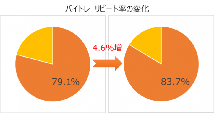 10月のリピート率は79.1%でしたが、12月には83.7%へと増加しています。リピート率は業務繁忙の状況によっても変化するデータですが、給与即払いの導入によってある程度の効果があったと考えられます。